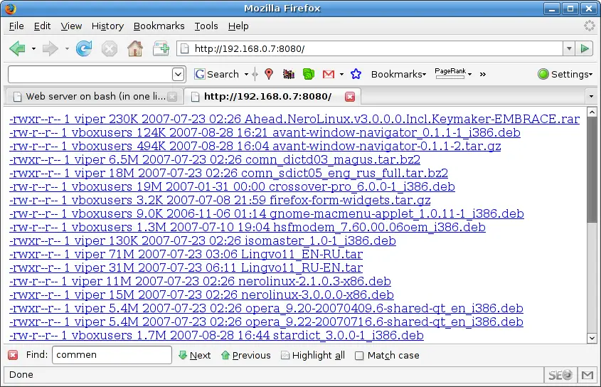 Just run it and then load web page http://192.168.0.7:8080, where 192.168.0.7 is IP address of the Linux machine you’ve started above mentioned bash script. You’ll see links to files located in directory the script was started at. My respect to Alexey Sveshnikov.